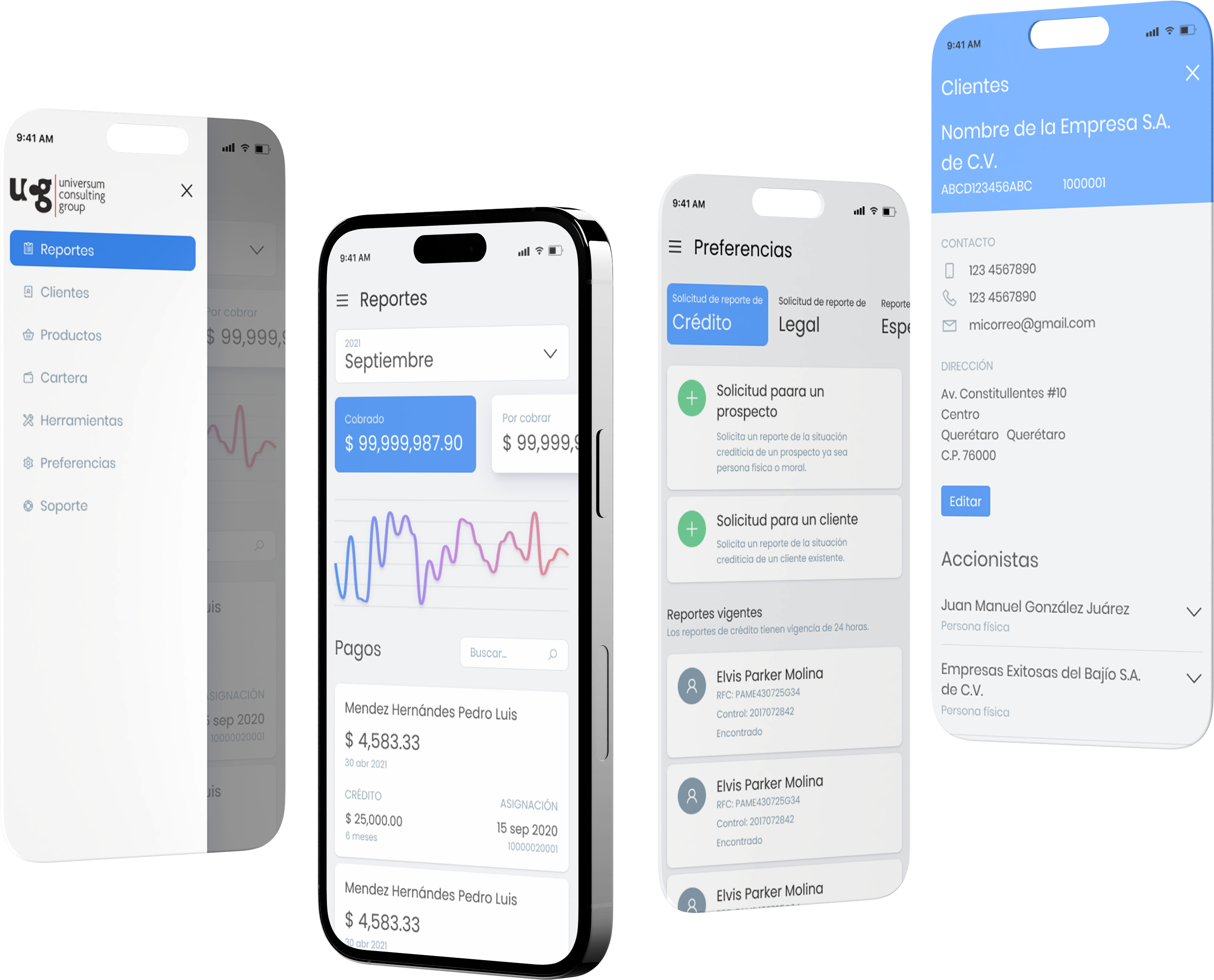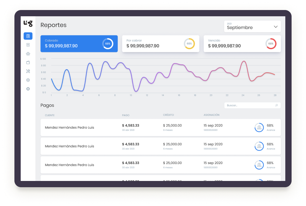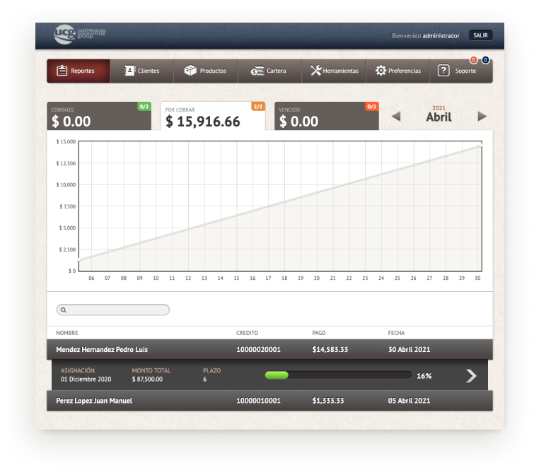 UCG ayuda a empresas grandes y pequeñas a llevar registro y seguimiento de los crédito otorgados a sus clientes, logrando a minimizar cartera vencida y costos de cobranza, además que genera los reportes correspondientes al buró de crédito nacional.