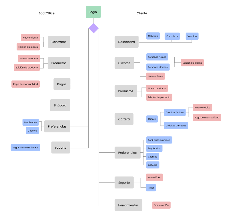 La navegación del sitio se diseñó en 2 partes: por un lado los usuarios deben acceder a la información de sus clientes, gestionar sus créditos, agregar nuevos servicios, etc; y por otro lado los usuarios internos (UCG) gestionan a los clientes del sistema y resuelven tickets de servicio.